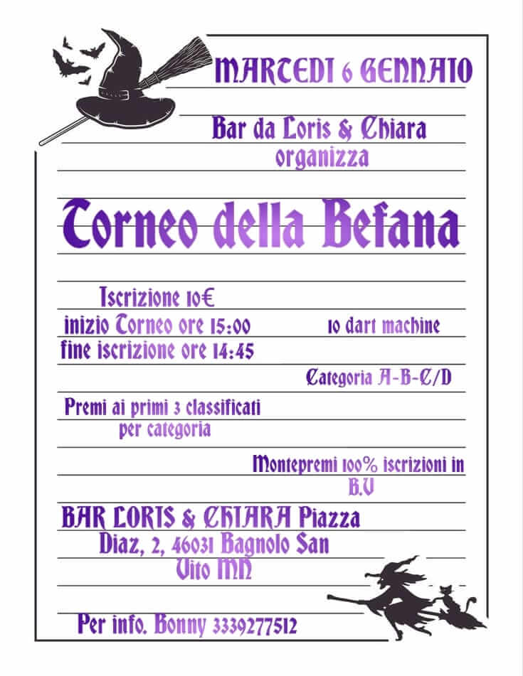 | 06.01.2026 15:15 | Torneo della Befana | Soft Dart - Torneo Singolo | Bar Loris | Bar Loris | 07.01.2026 | Torneo cat. A-B-C iscrizione 10€ 10 Darts machine | 75bonny75@gmail.com | 3339277512 | Torneo della Befana |